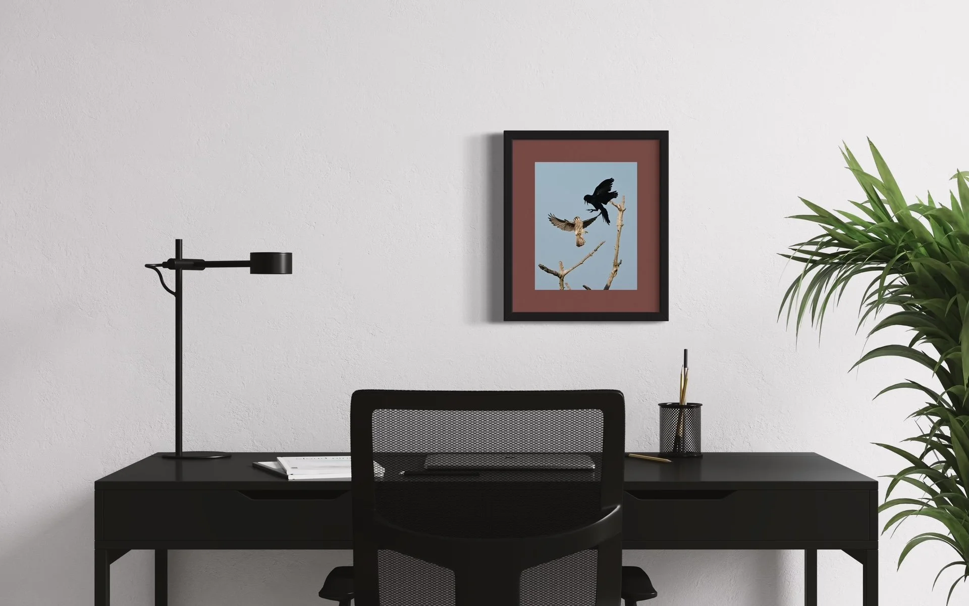 The fish crow, distinguished by its glossy black feathers and a more robust body compared to the kestrel, arrives on the scene, cawing loudly. It's a highly intelligent bird, known for its adaptability, and in this encounter, it mirrors the kestrel's aggression.